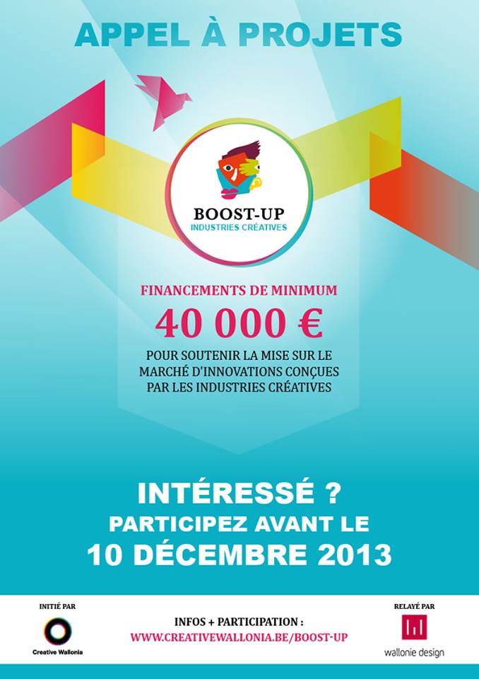 En pratique : les candidatures sont ouvertes jusqu’au 10 décembre 2013 midi, via www.creativewallonia.be/boost-up/participer.